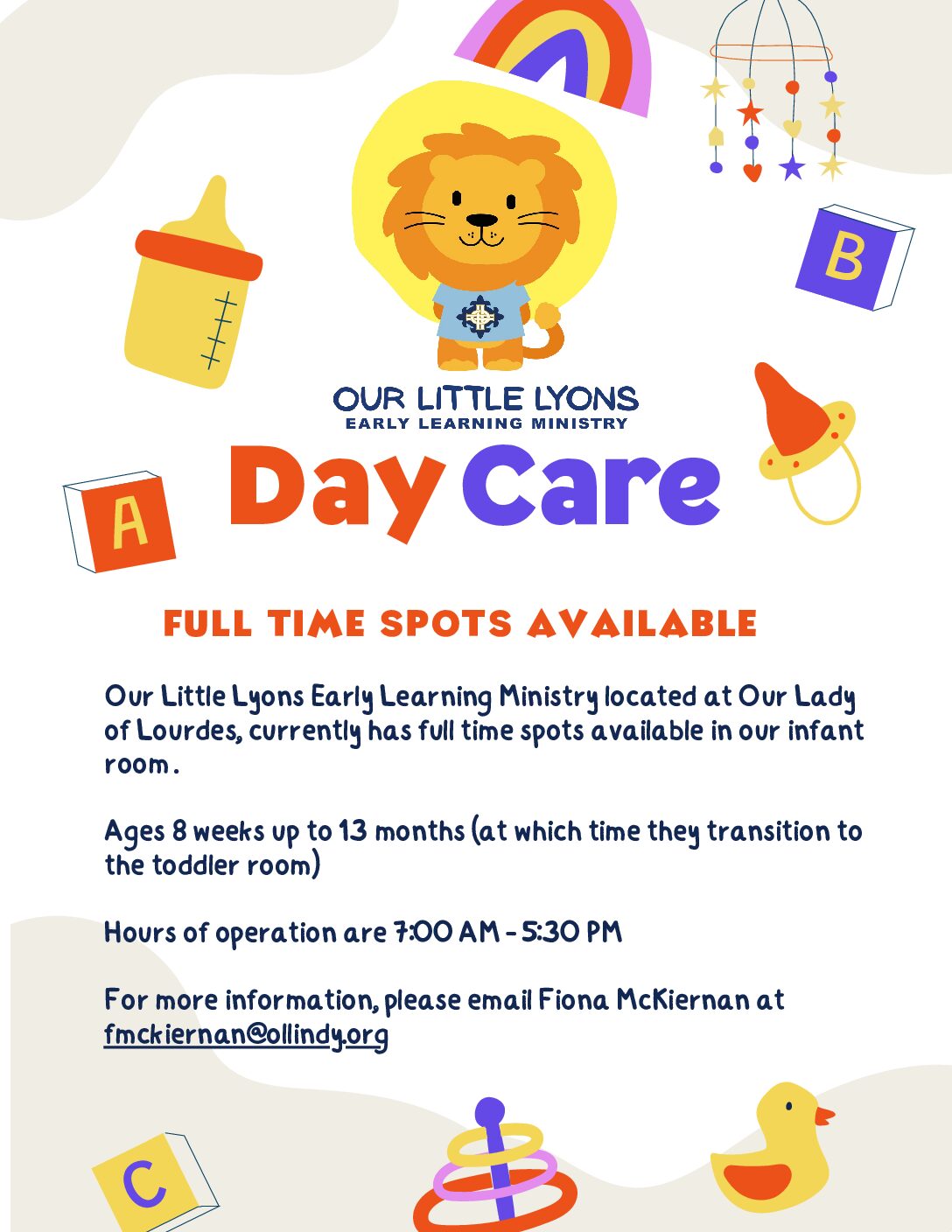 Our Little Lyons – Early Learning Ministry (OLL-ELM) is a nurturing, accredited daycare on the campus of Our Lady of Lourdes. We have designed our program around the idea that children learn in different ways through various activities. Our Little Lyons children are actively engaged in hands-on social, academic, and faith concepts throughout the day. Our Christ-centered, caring community provides a well-rounded, fun learning experience to empower your child.